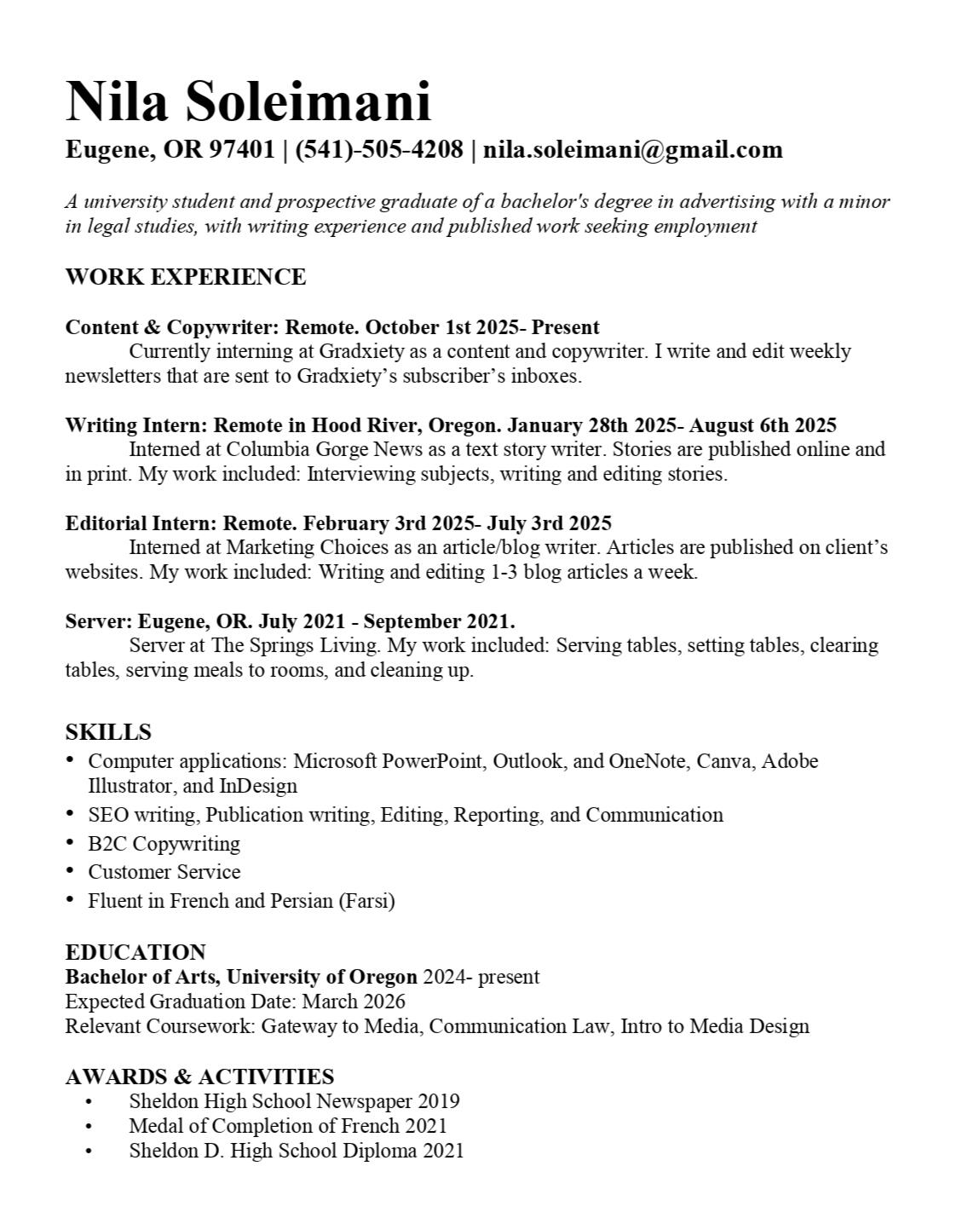I’m an Advertising student at the University of Oregon in the school of Journalism and Communications in my final year. I'm also minoring in Legal Studies and currently interning at Gradxiety as a Content & Copywriter.I've previously interned at Columbia Gorge News as a Writing Intern. Columbia Gorge News is a Hood River, Oregon based newspaper. I interviewed subjects, then wrote and edited stories that were later published online and in print.I've also interned at Marketing Choices as an Editorial Intern. Marketing Choices is a marketing agency that provides social media management and marketing design services. My roles included writing and editing 1-3 SEO-friendly articles a week for clients. These articles are published on client websites.